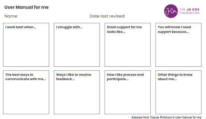 Working with the team at the Jo Cox Foundation has really highlighted the importance of an understanding workplace. A fundamental element of the way we all work together at the Foundation is that we understand that everyone has their own way of working and times of the day when they are at their most productive. When we came together as a team to produce our ‘how we work’ cards, I and other members of the team really felt seen and acknowledged, and a sense of trust and respect was built within the team that each individual’s way of working would be respected as much as possible. I think this is such an important exercise to do with any team, especially a team who mostly works remotely as it allows us all to better understand each other.