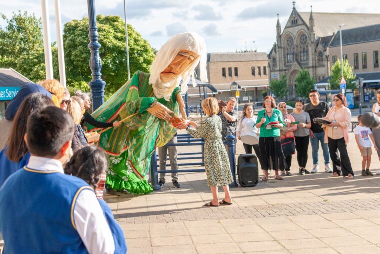 The idea came from Adam Strickson, Kim’s husband, who volunteers for 6 million+. Whilst intimate indoor events for days of commemoration happened at Kirklees town halls and the University of Huddersfield, the attendees included people who were either impacted or aware of genocides and persecution happening globally. Adam realised something needed to highlight the issues beyond those working with and supporting refugees and migrants. They needed an “on-the-street presence to get people’s attention,” and create an atmosphere to reach outside this circle of attendees. And so, the idea of a big Weeping Sister puppet was born.